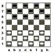 No inicio da partida, as pedras devem ser colocadas no tabuleiro sobre as casas escuras, da seguinte forma: nas três primeiras filas horizontais, as pedras brancas; e, nas três últimas, as pedras pretas. (diagrama abaixo).