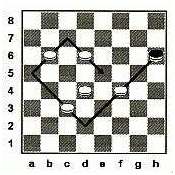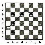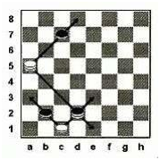 • Se no mesmo lance existir mais de uma forma de tomar, é obrigatório obedecer à "Lei da Maioria", ou seja, fazer o lance que tome o maior número de peças (diagrama abaixo).